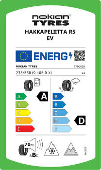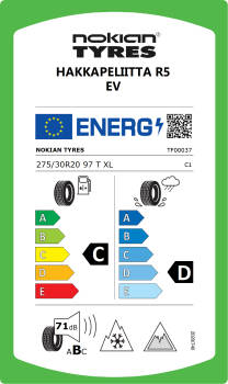 Hakkapeliitta R5 EV is a durable, comfortable and extremely energy efficient winter tire. Lighter rolling saves fuel and extends the range of electric vehicles. Due to the lightly rolling tread design and the new, EV tailored Green Trace compound, the rolling resistance of the Hakkapeliitta R5 EV has been improved even further. The eco-friendly driving features come from ingredients like canola oil, natural rubber, recycled steel, plant derived oils and pine resin. More than one third of the new compound consists of renewable and recycled materials.
