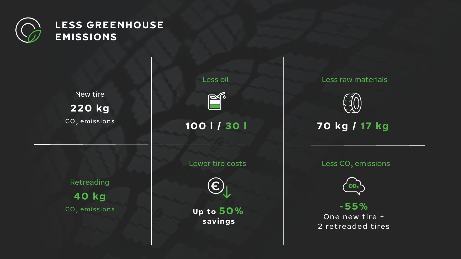 However, the carbon dioxide emissions inevitably caused by tire manufacturing can be minimized. Research shows that the carbon footprint of manufacturing a retreaded tire is about a quarter of the carbon footprint of manufacturing a new tire. The positive impact on the environment is even greater when the same tire is retreaded more than once.